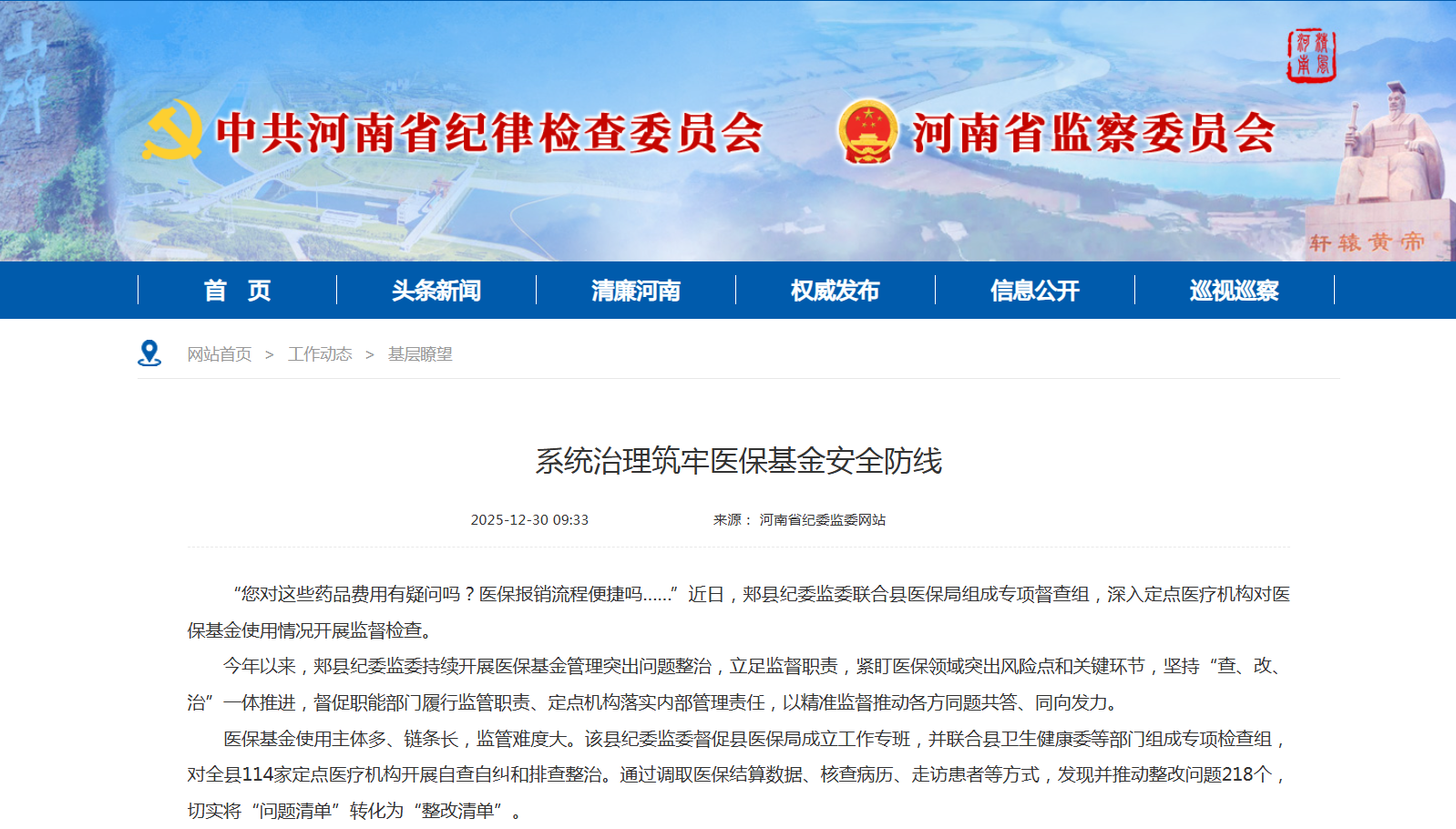 今年以来,郏县纪委监委持续开展医保基金管理突出问题整治,立足监督职责,紧盯医保领域突出风险点和关键环节,坚持“查、改、治”一体推进,督促职能部门履行监管职责、定点机构落实内部管理责任,以精准监督推动各方同题共答、同向发力。