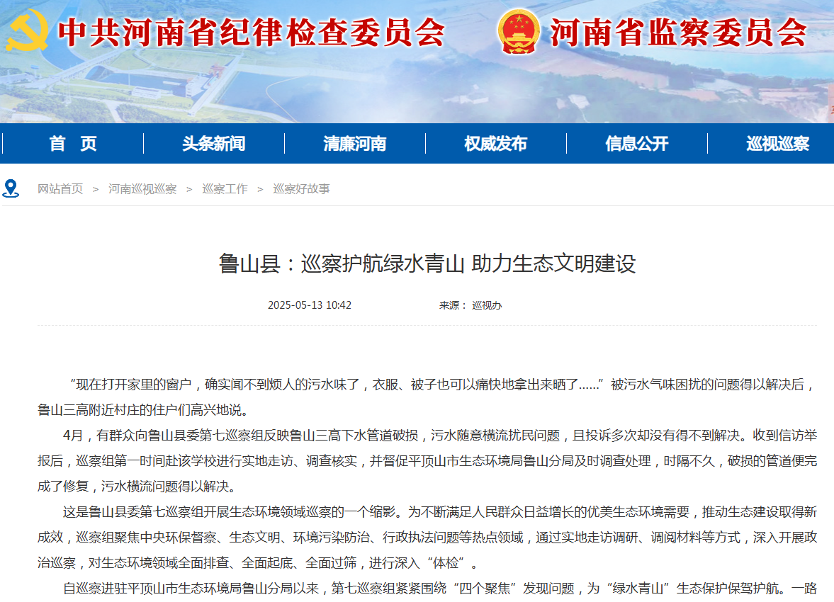 在此基础上,巡察组对巡察中发现的问题,认真研判分析,特别是对人民群众反映强烈的生态环境问题精准亮剑,做到督促落实立行立改、边巡边改。同时市生态环境局鲁山分局对巡察发现的空气污染防治等方面存在的问题,高度重视联动联勤,确保空气质量持续改善。一是高位统筹部署。建立“双组长”领导机制,由党政主要负责同志牵头成立空气质量达标创建领导小组,下设 6 个工作专班,统筹推进工业减排、扬尘治理等重点工作。二是压实责任链条。构建“党政同责+行业监管+企业主体”责任体系,坚持“抓源头”“源头抓”,对 10 个重点行业领域实施“三管三必须”管理,开展环保约谈 3 次,倒逼责任落实。三是深化部门协同。完善大气污染防治联防联控工作机制,盯紧重要时段、重点区域、重点行业,开展联合执法 20 次,查处整改问题 30 余个。