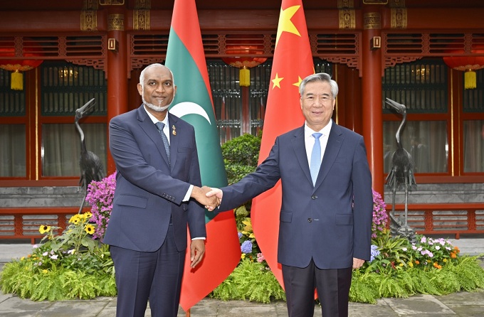 中共中央政治局常委、中央纪委书记李希2日在北京会见来华出席2025年上海合作组织峰会和纪念中国人民抗日战争暨世界反法西斯战争胜利80周年活动的马尔代夫总统穆伊兹。