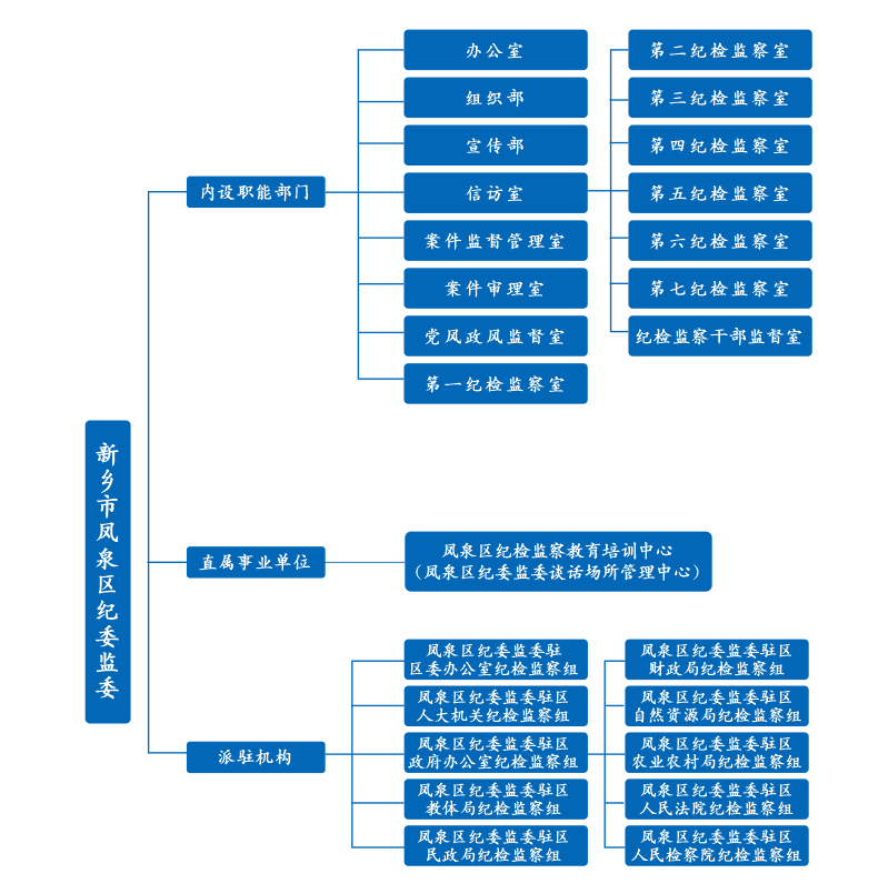 中国共产党凤泉区纪律检查委员会机关与凤泉区监察委员会合署办公,共有15个内设机构,分别为:办公室、组织部、宣传部、信访室、案件监督管理室、案件审理室、党风政风监督室、第一纪检监察室至第七纪检监察室、纪检监察干部监督室。下属1个事业单位:凤泉区纪检监察教育培训中心(凤泉区纪委监委谈话场所管理中心),内设信息技术保障室。