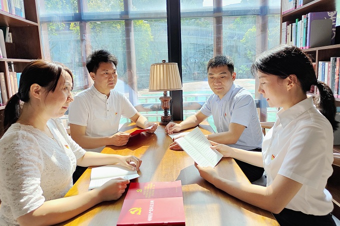 新密市纪委监委注重青年干部业务知识培养和能力素质提升,采取轮流授课的方式,促进纪检监察干部业务水平提升。图为该市纪检监察干部对党内法规开展集中学习。(新密市纪委监委 梁红玉 摄)