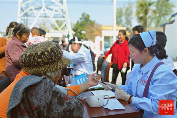 河南省周口市商水县医务人员在姚集镇开展爱国卫生运动月义诊宣传活动,为群众免费测量血压、发放基本医疗药品,宣传卫生常识,树立健康文明新风尚。(河南省周口市商水县纪委监委供 葛长艳 摄)