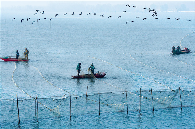 立冬时节,成群结队的鸟儿迎着寒风,伸展着双翼在湖面上翩翩起舞,渔民们全副武装,泛舟湖面,撒网捕捞,为萧瑟的初冬增添一抹生机和活力。(孟州市纪委监委 李利霞 摄)