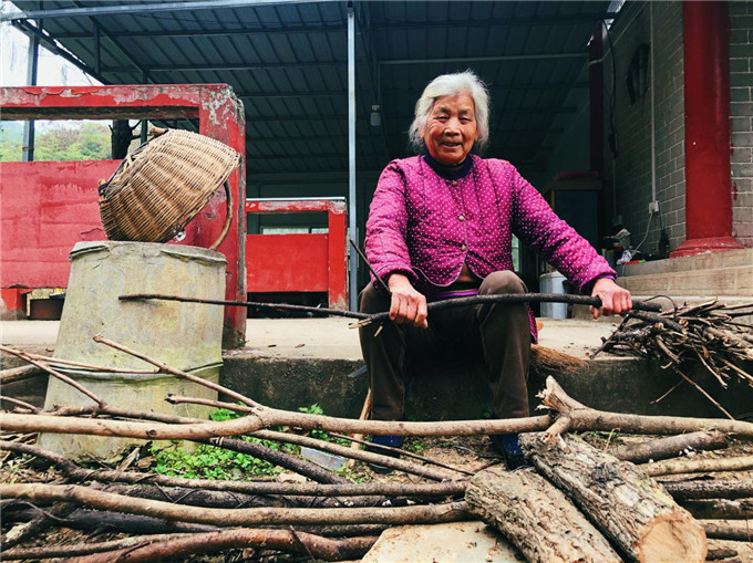 立冬将至,天气渐凉,老妪一边在门前晒太阳,一边将从山上捡来的木头折成一段一段,整齐地储存在门口,待过冬时使用。(郑州市中原区纪委监委 吴赛 摄)