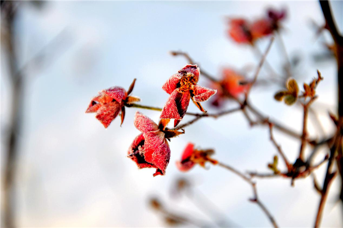 小雪时节,气温骤降,晶莹的霜花像一层白色的外衣披在草木之上,为寒冷萧瑟的冬季凭添几分姿色。(商水县纪委监察委 郭俊典 摄)