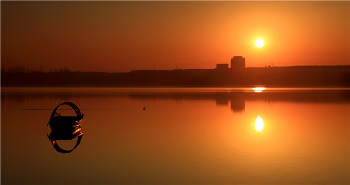 小雪时节,夕阳把湖面、船只润染成橘红色,一只水鸟从如镜的湖面滑过,留下一串串轻盈的足印,向湖心荡漾而去,站在湖边远眺,一切都显得恬静而美好。(鹤壁市山城区纪委监委 李玉和 摄)