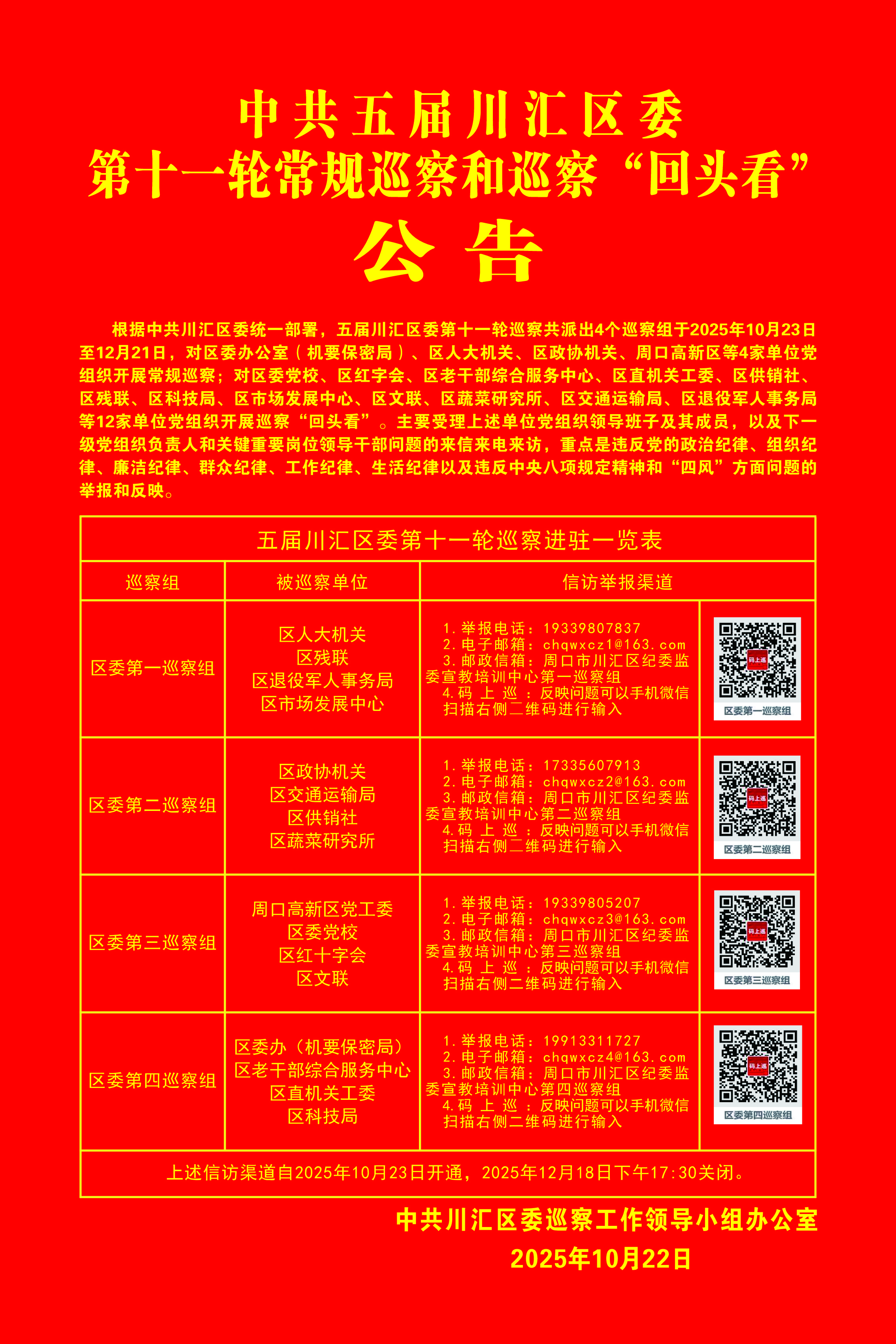 五届川汇区委第十一轮巡察完成进驻 联系方式公布