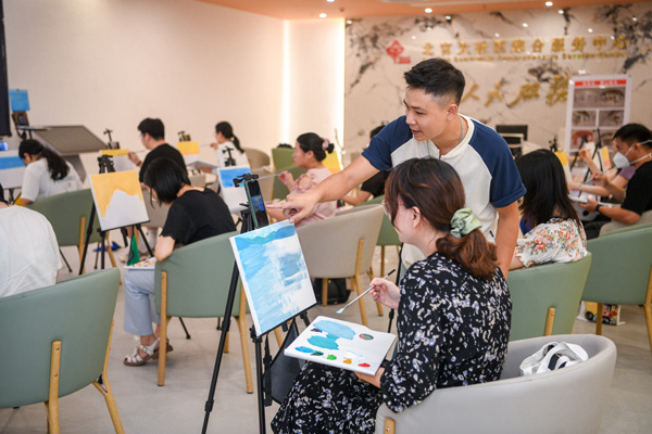 海南省海口市琼山区根据青年特点和需求设置文化艺术课程,从高校和专业机构聘请师资队伍负责教学工作,丰富青年业余时间的精神文化生活。图为在琼山区府城街道北官大社区综合服务中心,琼山区青年之家·青年夜校的丙烯油画班场景。(海南省海口市纪委监委供 苏弼坤 摄)
