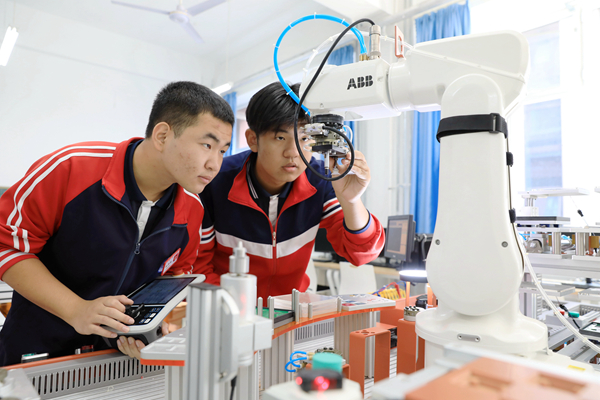 山东鲁中职业学院立足现代职业教育要求开展实操技能实训,让职业教育与就业场景紧密结合,有效赋能学生适岗、胜任,培养社会和用人单位认可、满意的高素质技术专业人才。山东鲁中职业学院工业机器人技术应用专业的学生正在进行现场编程技能实训。(山东省邹平市纪委监委供 袭龙生 摄)